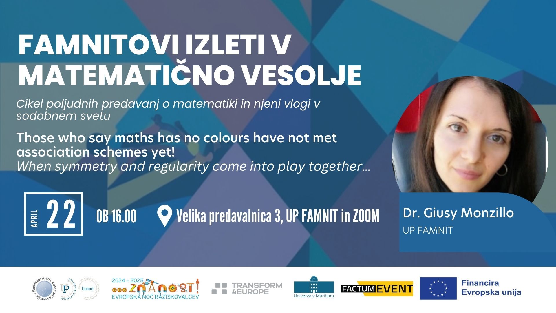 You are invited to the next Famnits' Excursion into the Mathematical Universe, titled Those who say maths has no colours have not met association schemes yet! When symmetry and regularity come into play together..., on Wednesday, 22. April 2026, 4:00 pm, at VP3 Lecture room and via Zoom. The lecturer is Dr. Giusy Monzillo, UP FAMNIT.