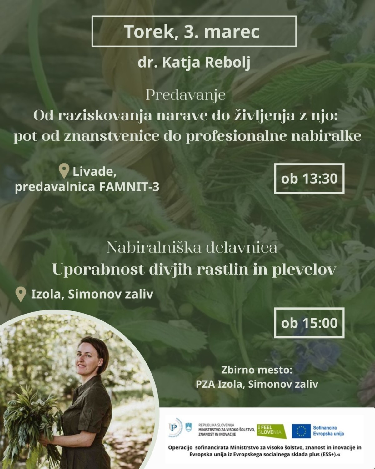 Prva aktivnost v sklopu projekta bo potekala v torek, 3. 3. 2026 in bo združevala predavanje z naslovom Od raziskovanja narave do življenja z njo: pot od znanstvenice do profesionalne nabiralke ter nabiralniško delavnico: Uporabnost divjih rastlin in plevelov. Predavanje in delavnico bo izvedla dr. Katja Rebolj.