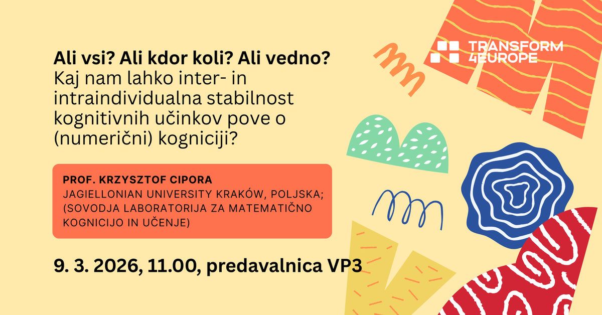 Vabimo vas na seminar z naslovom Ali vsi? Ali kdor koli? Ali vedno? Kaj nam lahko inter - in intraindividualna stabilnost kognitivnih učinkov pove o (numerični) kogniciji?, ki ga bo 9. 3. 2026, ob 11.00, izvedel Prof. Krzysztof Cipora. Predavanje bo potekalo v živo v predavalnici VP3 na UP FAMNIT.