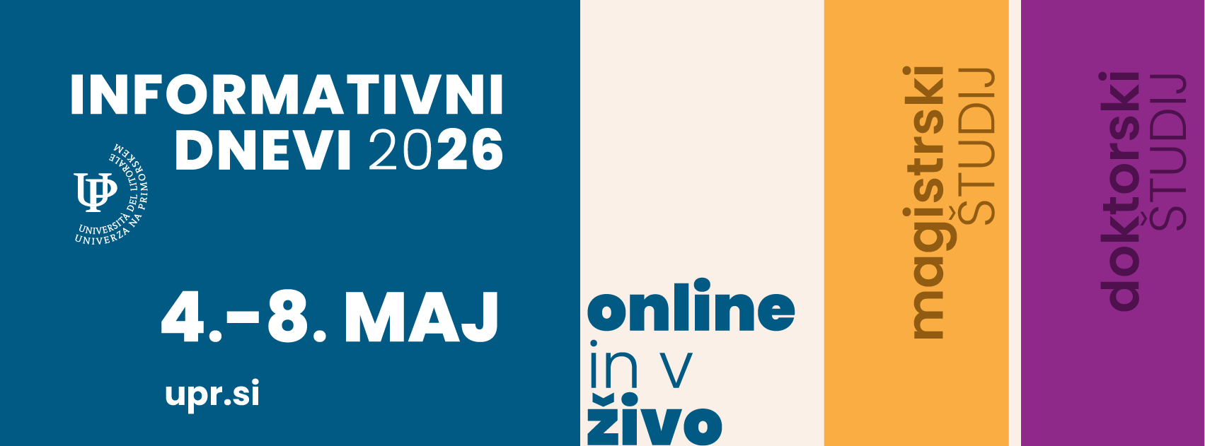 | 12:00–13:00 | [IN SLOVENE] ZOOM Application and enrolment procedure: presentation of the application and enrolment procedure (UP Enrolment Office - description of the enrolment and application procedure, presentation of the Scholarship Fund) |