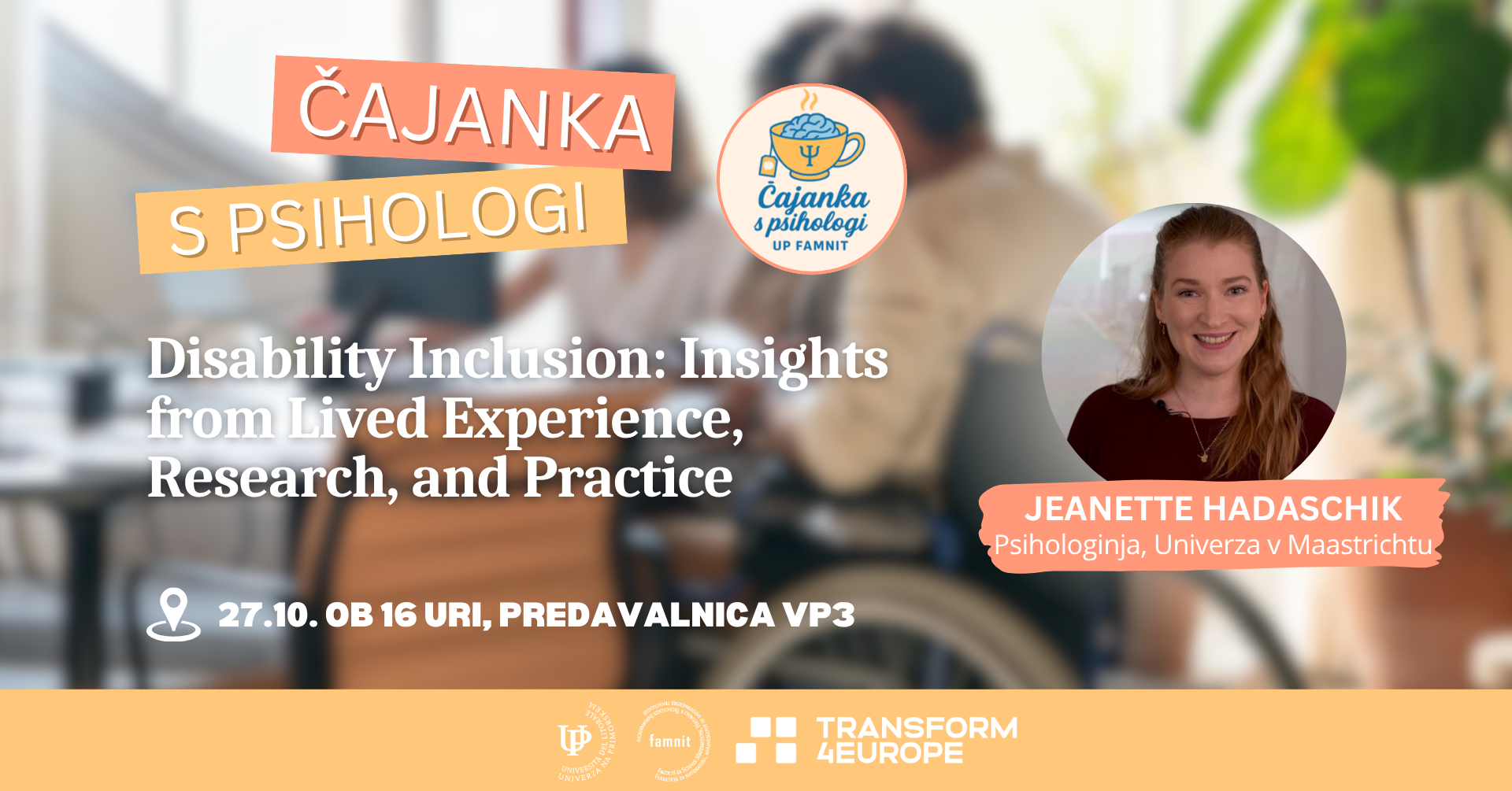 At this Tea Time, research psychologist and consultant Jeanette Hadaschik (MSc) will share insights on disability inclusion, drawing from her own lived experience, academic research, and practical involvement in creating more inclusive work environments. The talk will introduce key concepts, such as ableism and the social versus medical model of disability, illustrating how they influence participation and belonging in education, work, and daily life. Jeanette will also share insights from her own experience contributing to disability inclusion initiatives at Maastricht University, including the UnliMited Network and the Disability Inclusion Group, and discuss what can help institutions move toward greater inclusion.